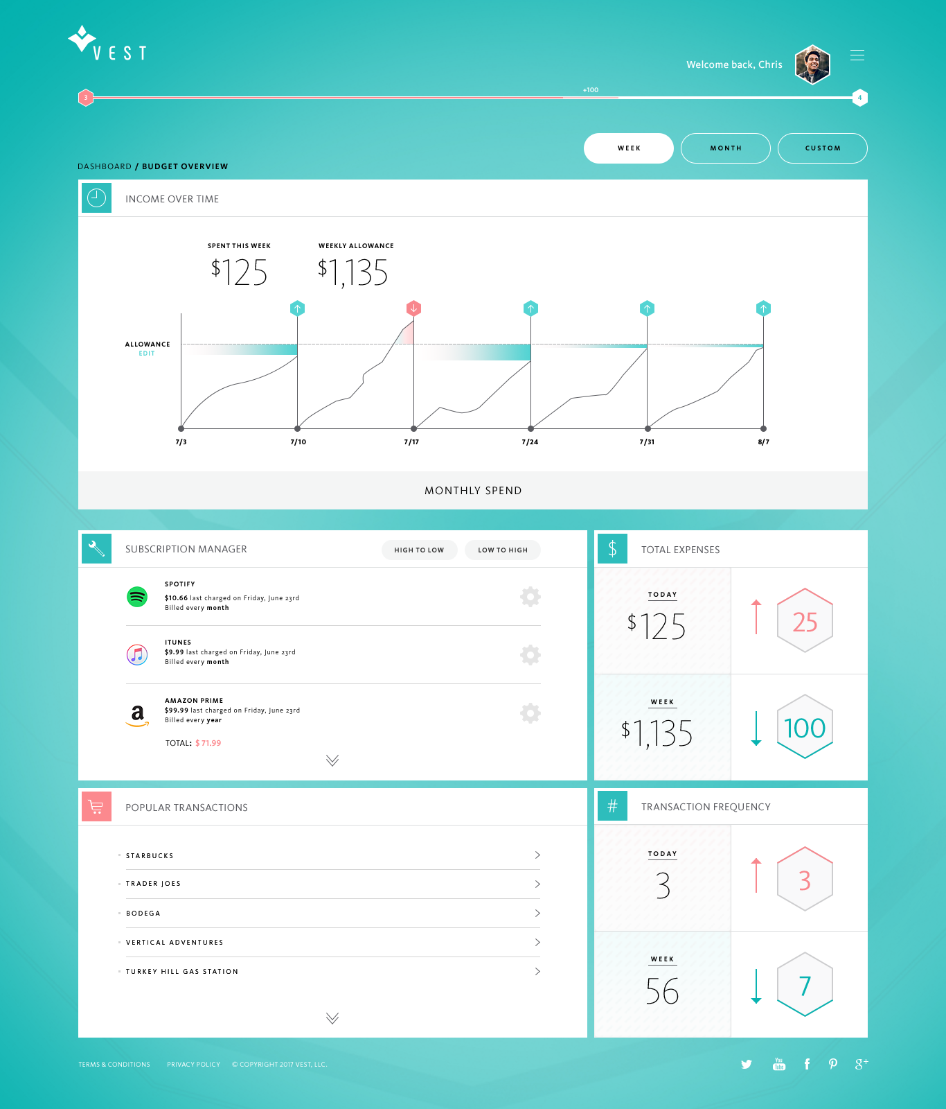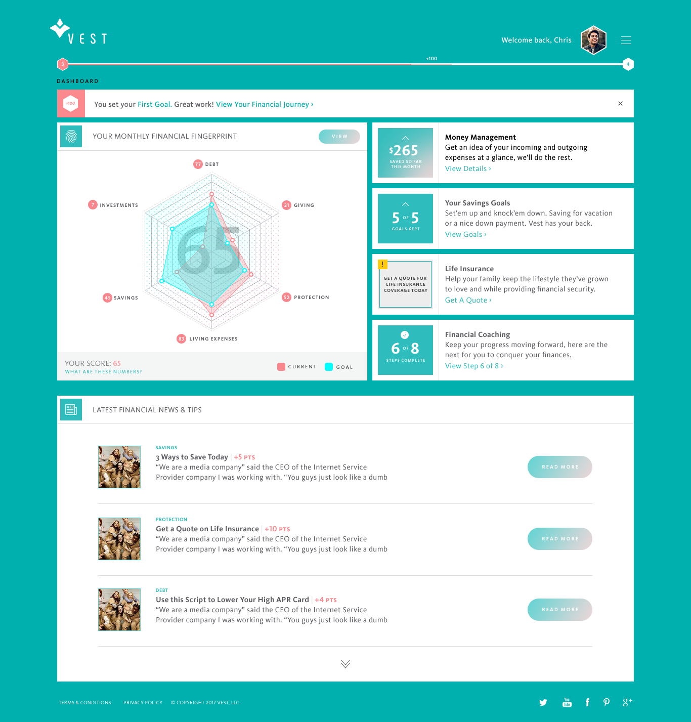 Vest partnered with our team to elevate their brand and user experience with the goal of empowering users to take control of their financial fitness. The platform was designed to help customers track spending, identify opportunities to reduce variable expenses, and receive personalized, actionable advice to improve their financial wellness.